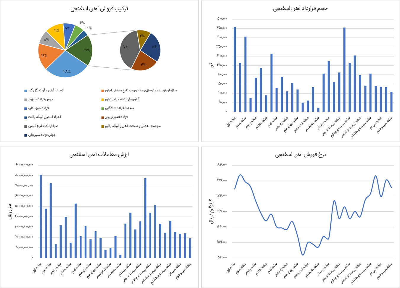 نمودارهای زیر ترکیب فروش، ارزش معاملات، حجم قرارداد و نرخ فروش آهن اسفنجی را نشان میدهد. آهن اسفنجی از ابتدای سال جاری تا هفته سی و دوم، حدودا 5 میلیون و 940 هزار تن جمعا به ارزش 101،000 میلیارد تومان در بورس کالا معامله شده است. شرکت های سازمان توسعه و نوسازی معادن و صنایع معدنی ایران، توسعه آهن و فولاد گل گهر، پارس فولاد سبزوار، فولاد غدیر نی ریز، صبا فولاد خلیج فارس و آهن و فولاد غدیر ایرانیان بالغ بر 90 درصد عرضه این محصول را در بورس کالا بر عهده دارند. این محصول در حال حاضر 17.7 میلیون تومان به ازای هر تن معامله میشود که نسبت به هفته گذشته کاهش 1.35 درصدی داشته است.
