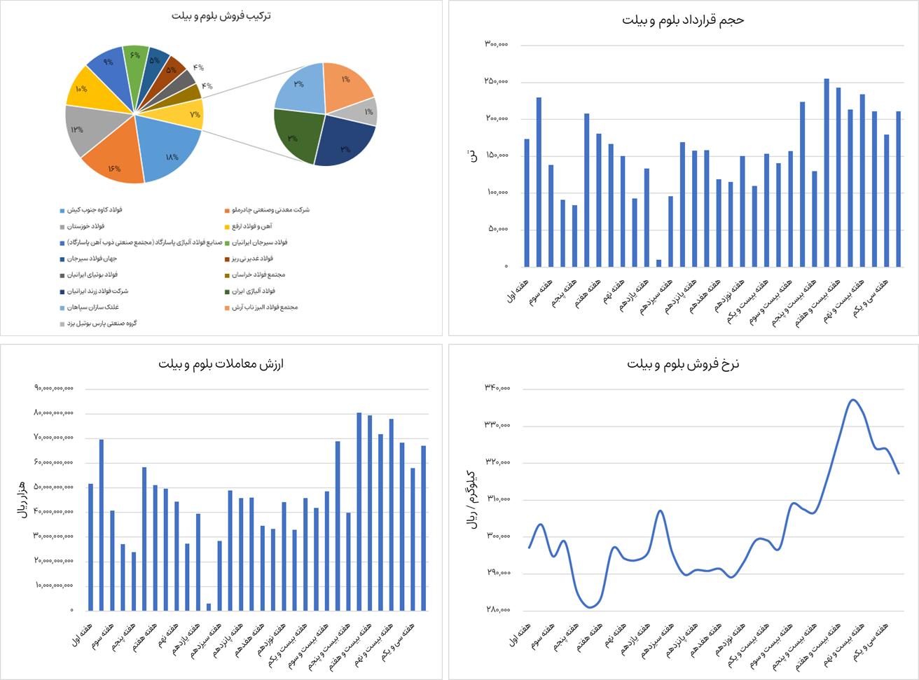 نمودارهای زیر ترکیب فروش، ارزش معاملات، حجم قرارداد و نرخ فروش بلوم و بیلت را نشان میدهد. بلوم و بیلت از ابتدای سال جاری تا هفته سی و دوم، حدودا 5 میلیون و 88 هزار تن جمعا به ارزش 155،000 میلیارد تومان در بورس کالا معامله شده است. شرکتهای زیادی این محصول را در بورس کالا عرضه میکنند. فولاد خوزستان، معدنی و صنعتی چادرملو، فولاد کاوه جنوب کیش، فولاد سیرجان ایرانیان، آهن و فولاد ارفع، مجتمع صنعتی ذوب آهن پاسارگاد، جهان فولاد سیرجان و فولاد زرند ایرانیان بالغ بر 85 درصد عرضه این محصول را در بورس کالا به عهده دارند. بلوم و بیلت در حال حاضر 31.7 میلیون تومان به ازای هر تن در حال معامله است که نسبت به هفته گذشته کاهش 2 درصدی داشته است.
