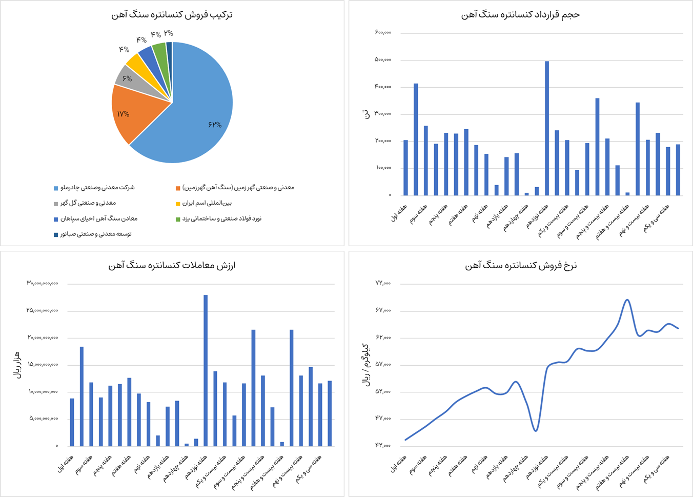 نمودارهای زیر ترکیب فروش، ارزش معاملات، حجم قرارداد و نرخ فروش کنسانتره سنگ آهن را نشان میدهد. کنسانتره سنگ آهن از ابتدای سال جاری تا هفته سی و دوم، 5 میلیون و 586 هزار تن جمعا به ارزش حدودا 30،850 میلیارد تومان در بورس کالا معامله شده است. شرکتهای فولاد امیرکبیر کاشان، فولاد مبارکه اصفهان، فولاد تاراز چهارمحال، ورق خودروی چهارمحال و بختیاری و صنایع هفت الماس بالغ بر 95 درصد عرضه این محصول را در بورس کالا به عهده دارند. این محصول در حال حاضر حدودا 6.4 میلیون تومان به ازای هر تن معامله میشود که نسبت به هفته گذشته کاهش 1.3 درصدی داشته است.