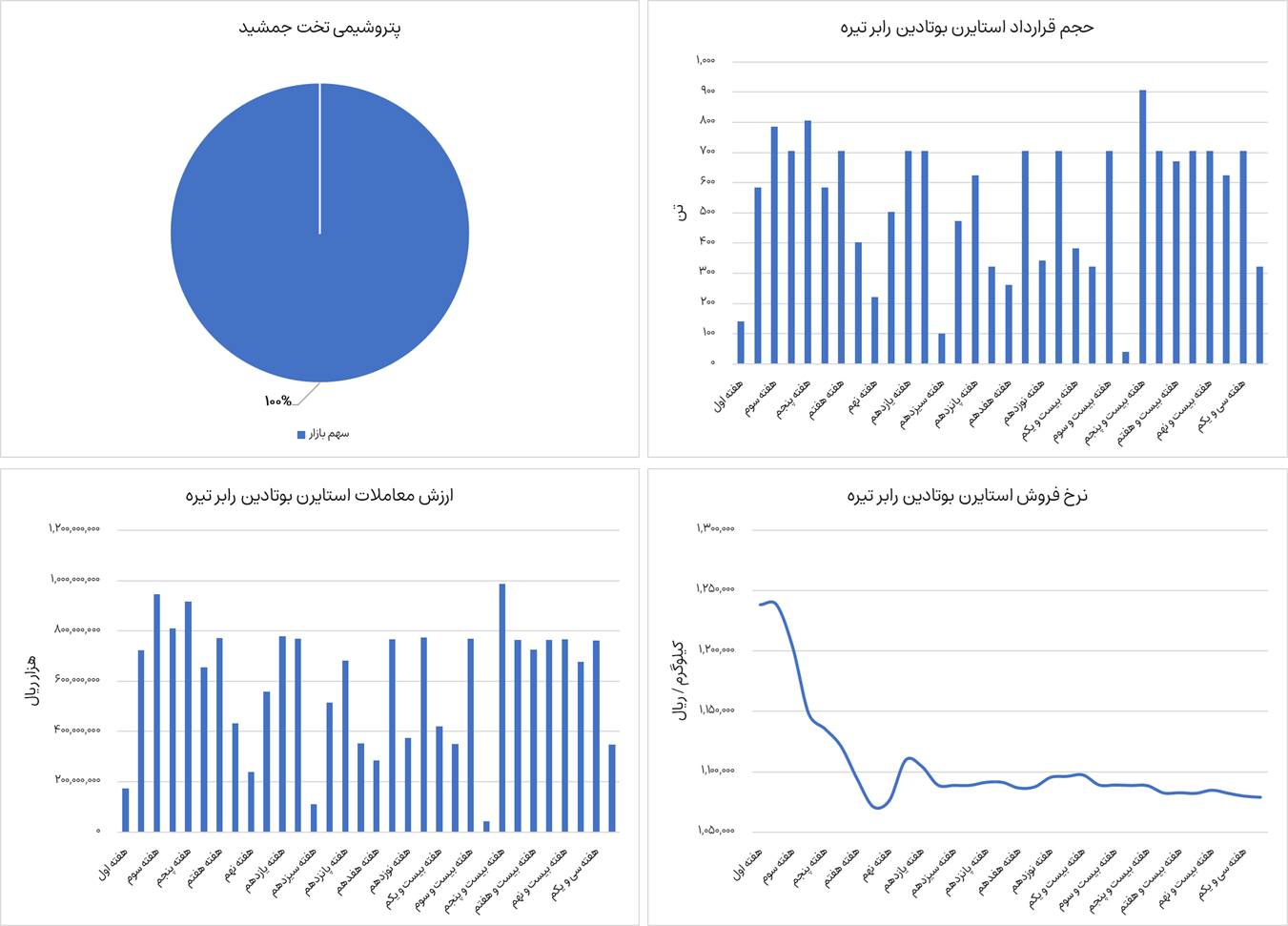 نمودارهای زیر ترکیب فروش، ارزش معاملات، حجم قرارداد و نرخ فروش استایرن بوتادین رابر تیره  را نشان می‌دهد. استایرن بوتادین رابر تیره از ابتدای سال جاری تا هفته سی و دوم، حدودا  17،200  تن جمعا به ارزش  1،900 میلیارد تومان در بورس کالا معامله شده است. شرکت پتروشیمی تخت جمشید عرضه این محصول را در بورس کالا به عهده دارند. نرخ فروش این محصول در حال حاضر  108 میلیون تومان به ازای هر تن معامله می‌شود که نسبت به هفته گذشته تغییری نداشته است.