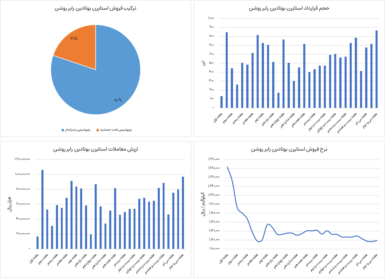 نمودارهای زیر ترکیب فروش، ارزش معاملات، حجم قرارداد و نرخ فروش وکیوم باتوم  را نشان می‌دهد. وکیوم باتوم از ابتدای سال جاری تا هفته سی و دوم، حدودا  4 میلیون و 452 هزار  تن جمعا به ارزش  115،300 میلیارد تومان در بورس کالا معامله شده است. شرکت‌های پالایش نفت بندرعباس، پالایش نفت اصفهان، پالایش نفت تهران، پالایش نفت آبادان، پالایش نفت امام خمینی، پالایش نفت شیراز و پالایش نفت تبریز عرضه این محصول را در بورس کالا به عهده دارند. نرخ فروش این محصول در حال حاضر  25.7 میلیون تومان به ازای هر تن معامله می‌شود که نسبت به هفته گذشته رشد 3.15 درصدی داشته است.