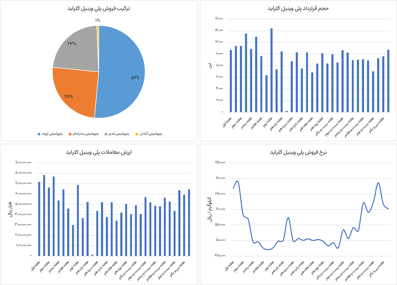 نمودارهای زیر ترکیب فروش، ارزش معاملات، حجم قرارداد و نرخ فروش پلی وینیل کلراید  را نشان می‌دهد. پلی وینیل کلراید از ابتدای سال جاری تا هفته ی سی و دوم، حدودا  301،800  تن جمعا به ارزش  16،300 میلیارد تومان در بورس کالا معامله شده است. شرکت های پتروشیمی اروند، پتروشیمی بندرامام، پتروشیمی غدیر و پتروشیمی آبادان عرضه این محصول را در بورس کالا به عهده دارند. نرخ فروش این محصول در حال حاضر  60.2 میلیون تومان به ازای هر تن معامله می‌شود که نسبت به هفته گذشته کاهش 2.5 درصدی داشته است.