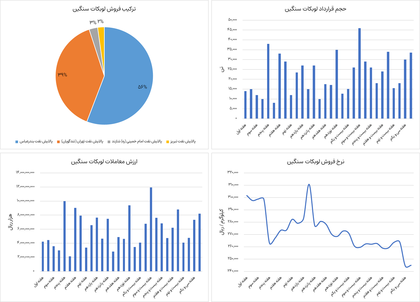 نمودارهای زیر ترکیب فروش، ارزش معاملات، حجم قرارداد و نرخ فروش لوبکات سنگین را نشان می‌دهد. لوبکات سنگین از ابتدای سال جاری تا هفته سی و دوم، حدودا  670،900  تن جمعا به ارزش  18،060 میلیارد تومان در بورس کالا معامله شده است. شرکت‌های پالایش نفت تهران و پالایش نفت بندرعباس عرضه این محصول را در بورس کالا به عهده دارند. نرخ فروش این محصول در حال حاضر  24.5 میلیون تومان به ازای هر تن معامله می‌شود که نسبت به هفته رشد 0.3 درصدی داشته است.