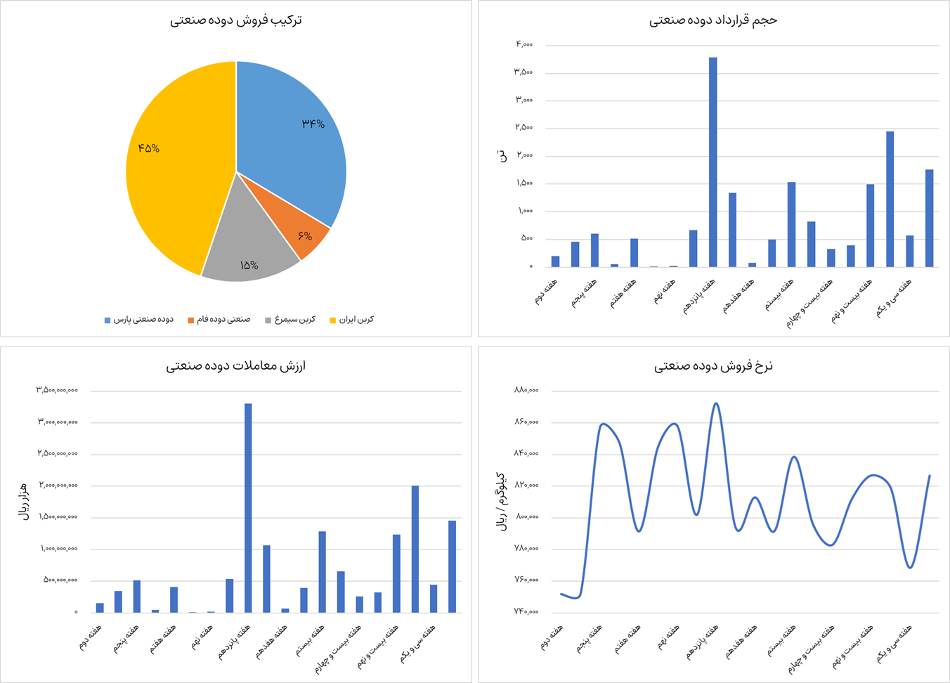 نمودارهای زیر ترکیب فروش، ارزش معاملات، حجم قرارداد و نرخ فروش دوده صنعتی  را نشان می‌دهد. دوده صنعتی از ابتدای سال جاری تا هفته سی و دوم، حدودا  17،600  تن جمعا به ارزش  1،453 میلیارد تومان در بورس کالا معامله شده است. شرکت‌های دوده صنعتی پارس، صنعتی دوده فام، کربن سیمرغ و کربن ایران عرضه این محصول را در بورس کالا به عهده دارند. نرخ فروش این محصول در حال حاضر  82.7 میلیون تومان به ازای هر تن معامله می‌شود که نسبت به هفته گذشته رشد 7.6 درصدی داشته است.
