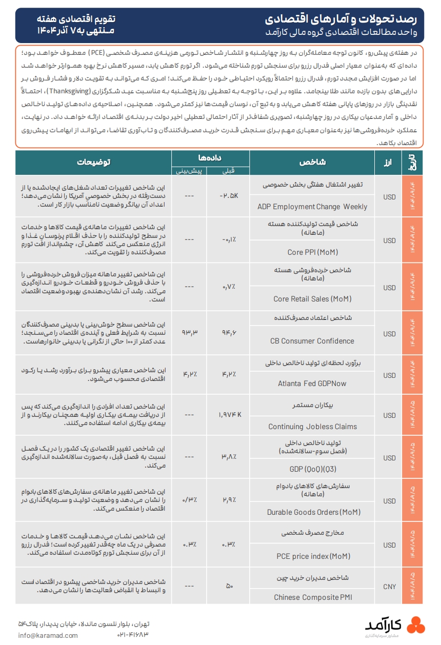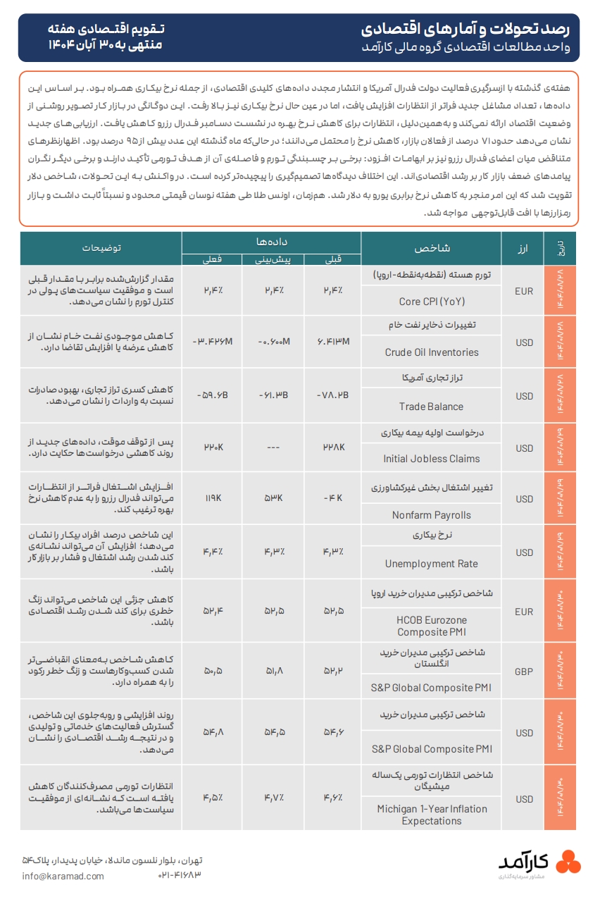 در چارچوب گزارشهای هفتگی گروه مالی کارآمد، هر هفته مروری جامع بر تحولات اخیر بازارهای جهانی ارائه میشود. این مرور ضمن بررسی رویدادها و دادههای اقتصادی منتشرشده، تصویری روشن از چشمانداز هفته پیشرو در اختیار فعالان بازار قرار میدهد.