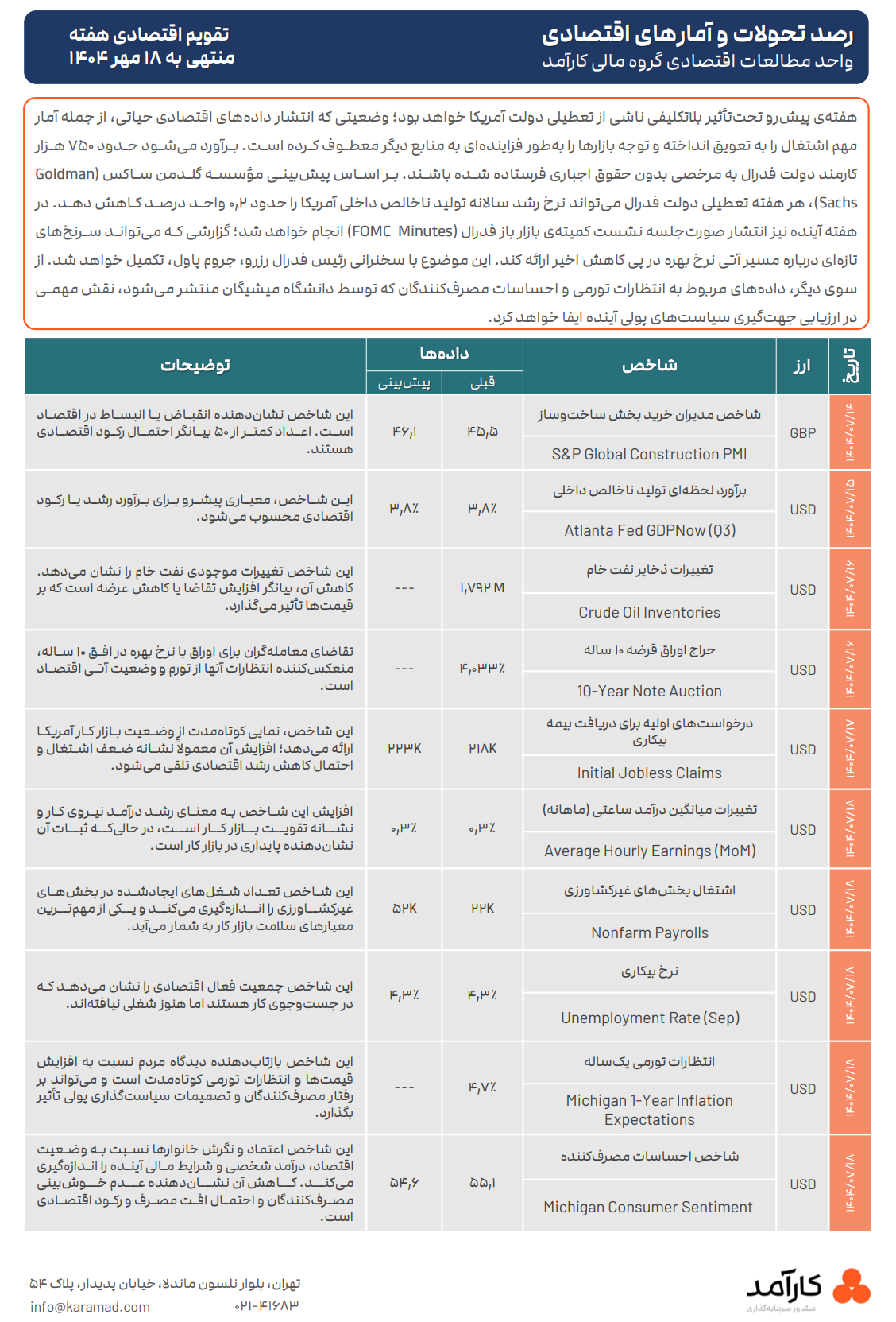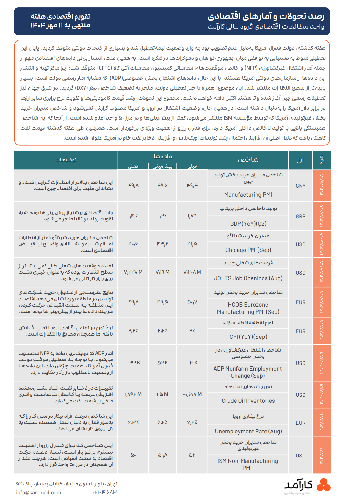 🔸️ در چارچوب گزارشهای هفتگی گروه مالی کارآمد، هر هفته مروری جامع بر تحولات اخیر بازارهای جهانی ارائه میشود. این مرور ضمن بررسی رویدادها و دادههای اقتصادی منتشرشده، تصویری روشن از چشمانداز هفته پیشرو در اختیار فعالان بازار قرار میدهد.