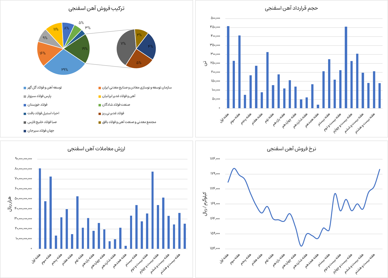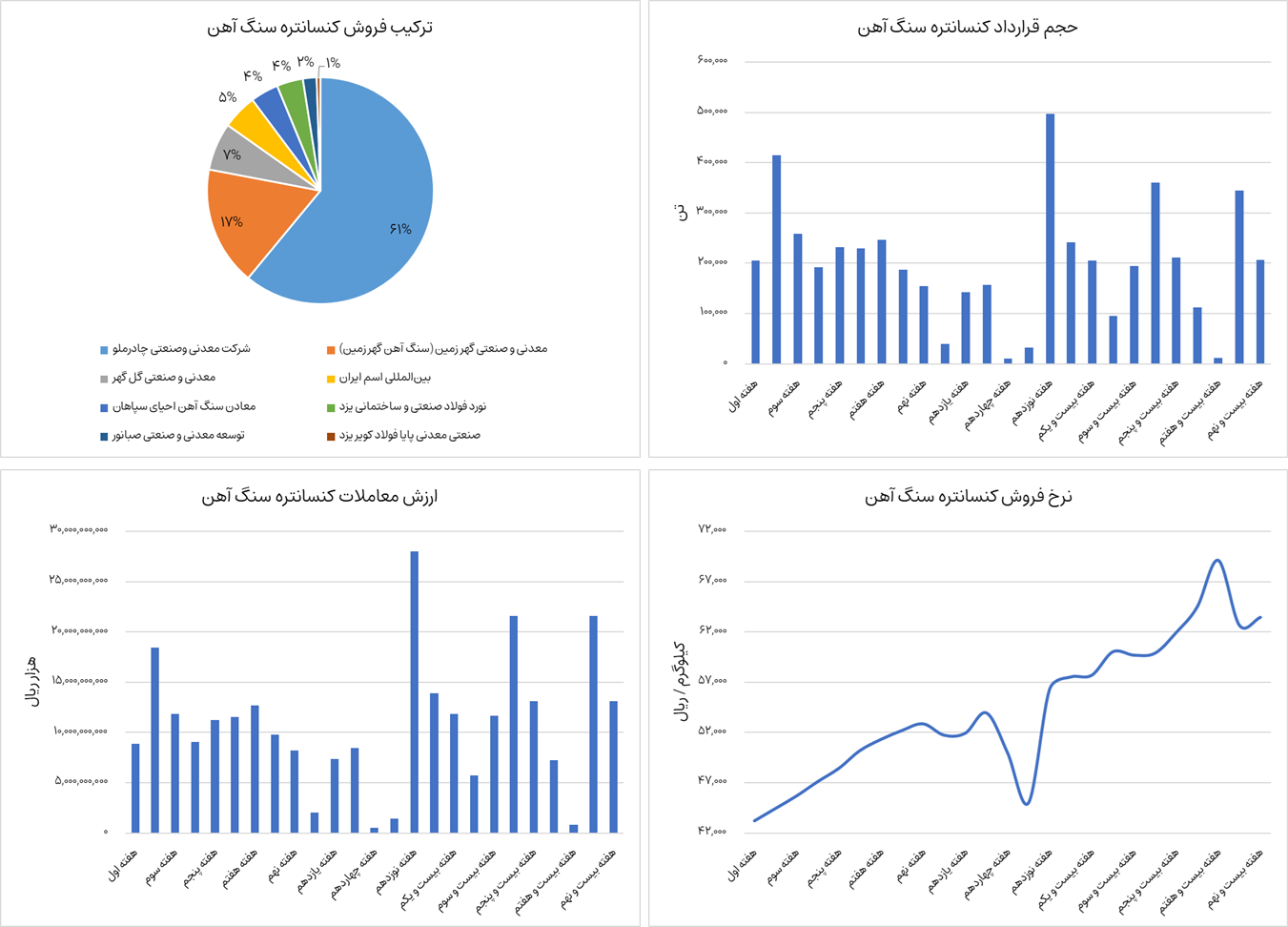 نمودارهای زیر ترکیب فروش، ارزش معاملات، حجم قرارداد و نرخ فروش کنسانتره سنگ آهن را نشان میدهد. کنسانتره سنگ آهن از ابتدای سال جاری تا هفته بیست و نهم، 4 میلیون و 985 هزار تن جمعا به ارزش حدودا 27،000 میلیارد تومان در بورس کالا معامله شده است. شرکتهای فولاد امیرکبیر کاشان، فولاد مبارکه اصفهان، فولاد تاراز چهارمحال، ورق خودروی چهارمحال و بختیاری و صنایع هفت الماس بالغ بر 95 درصد عرضه این محصول را در بورس کالا به عهده دارند. این محصول در حال حاضر حدودا 6.35 میلیون تومان به ازای هر تن معامله میشود که نسبت به هفته گذشته رشد 1.3 درصدی داشته است.