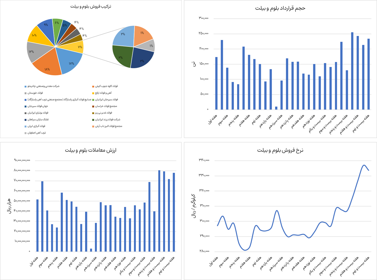 نمودارهای زیر ترکیب فروش، ارزش معاملات، حجم قرارداد و نرخ فروش بلوم و بیلت را نشان میدهد. بلوم و بیلت از ابتدای سال جاری تا هفته بیست و نهم ، حدودا 4 میلیون و 490 هزار تن جمعا به ارزش 135،700 میلیارد تومان در بورس کالا معامله شده است. شرکتهای زیادی این محصول را در بورس کالا عرضه میکنند. فولاد خوزستان، معدنی و صنعتی چادرملو، فولاد کاوه جنوب کیش، فولاد سیرجان ایرانیان، آهن و فولاد ارفع، مجتمع صنعتی ذوب آهن پاسارگاد، جهان فولاد سیرجان و فولاد زرند ایرانیان بالغ بر 85 درصد عرضه این محصول را در بورس کالا به عهده دارند. بلوم و بیلت در حال حاضر 33.4 میلیون تومان به ازای هر تن در حال معامله است که نسبت به هفته گذشته کاهش 1 درصدی داشته است.