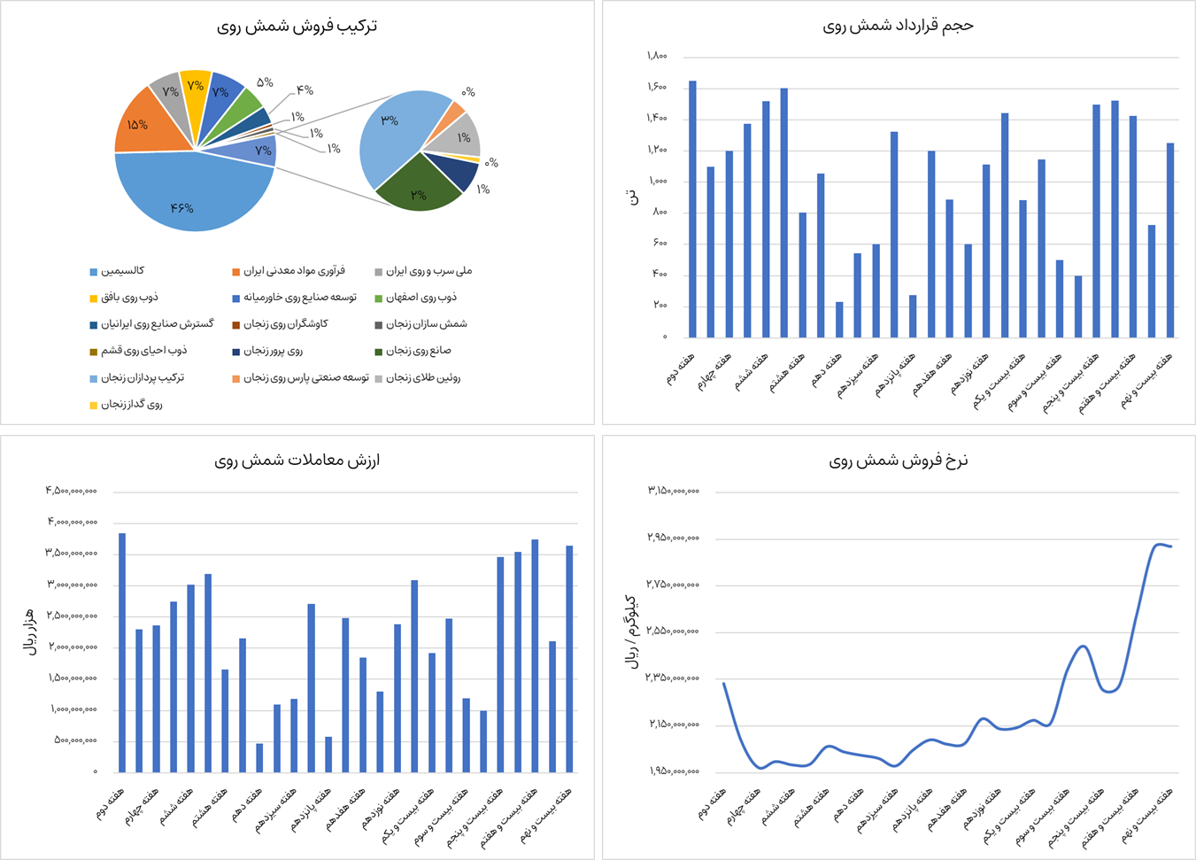 نمودارهای زیر ترکیب فروش، ارزش معاملات، حجم قرارداد و نرخ فروش شمش روی را نشان میدهد. شمش روی از ابتدای سال جاری تا هفته بیست و نهم، حدودا 27،900 تن جمعا به ارزش 6،150 میلیارد تومان در بورس کالا معامله شده است. شرکتهای کالسیمین، توسعه صنایع روی خاورمیانه، گسترش صنایع روی ایرانیان، فرآوری مواد معدنی ایران، ذوب روی بافق و صنایع خالص سازان روی زنجان بالغ بر 90 درصد عرضه این محصول را در بورس کالا به عهده دارند. نرخ فروش این محصول در حال حاضر 292 میلیون تومان به ازای هر تن معامله میشود که نسبت به هفته گذشته تغییری نداشته است.