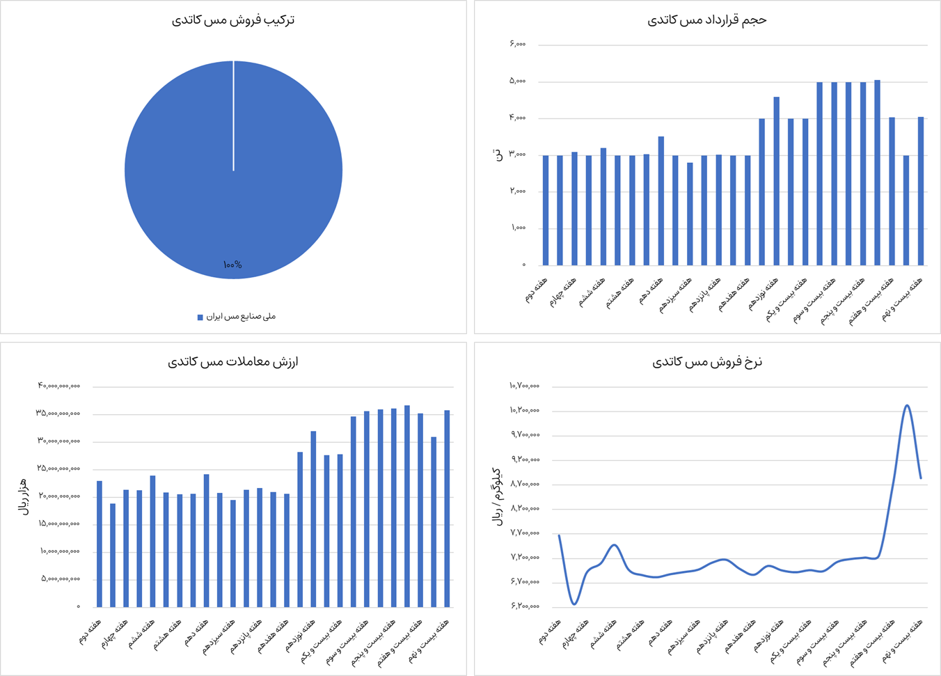 نمودارهای زیر ترکیب فروش، ارزش معاملات، حجم قرارداد و نرخ فروش مس کاتدی را نشان میدهد. مس کاتدی از ابتدای سال جاری تا هفته بیست و نهم، 98،400 تن جمعا به ارزش حدودا 71،650 میلیارد تومان در بورس کالا معامله شده است. تنها عرضه کننده مس کاتدی در بورس کالا، شرکت ملی صنایع مس ایران است. این محصول در حال حاضر 884 میلیون تومان به ازای هر تن معامله میشود که نسبت به هفته گذشته کاهش 14.4 درصدی داشته است.