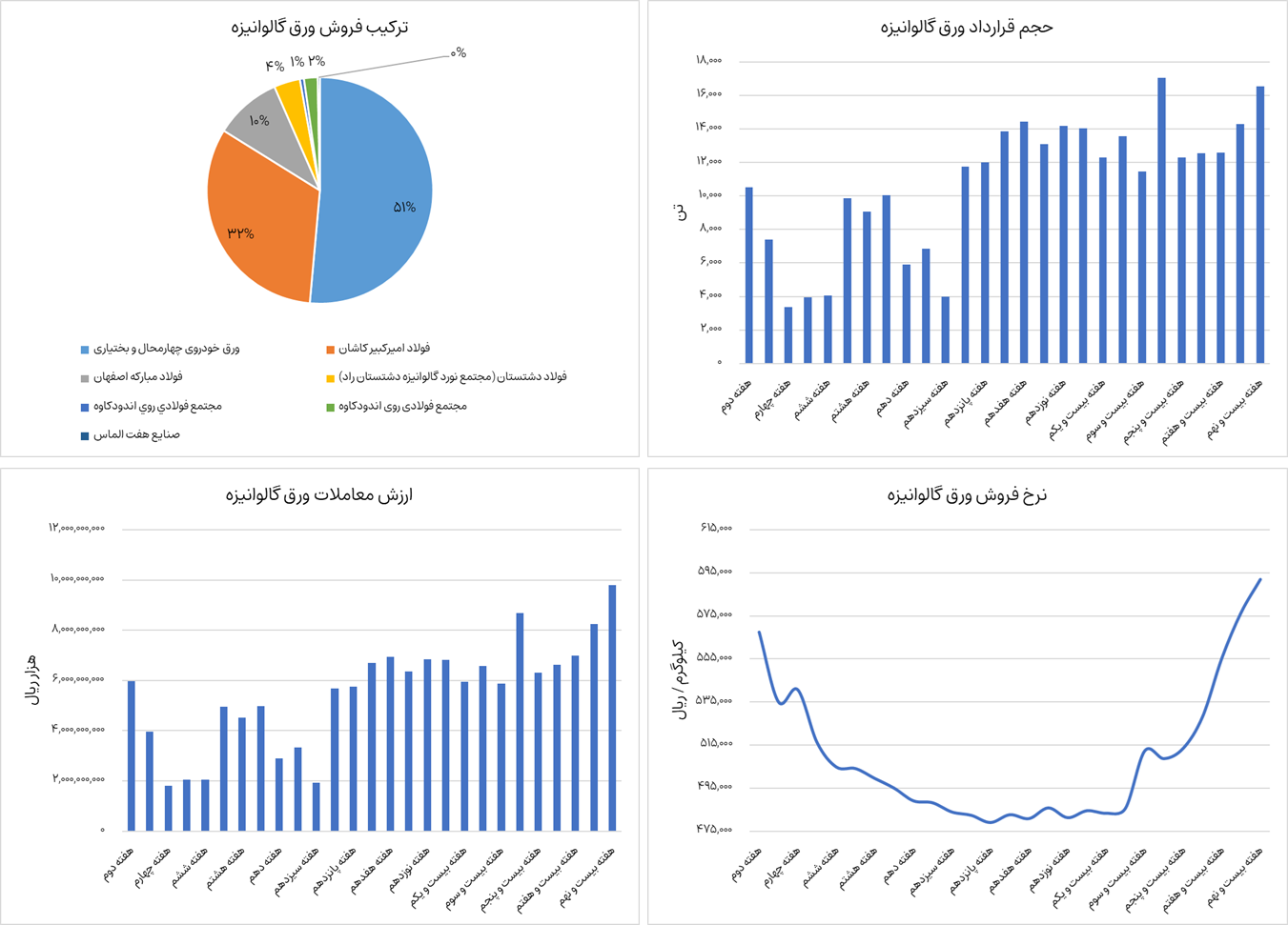 نمودارهای زیر ترکیب فروش، ارزش معاملات، حجم قرارداد و نرخ فروش ورق گالوانیزه را نشان میدهد. ورق گالوانیزه از ابتدای سال جاری تا هفته بیست و نهم، 291،000 تن جمعا به ارزش حدودا 14،850 میلیارد تومان در بورس کالا معامله شده است. شرکتهای فولاد امیرکبیر کاشان، فولاد مبارکه اصفهان، فولاد تاراز چهارمحال، ورق خودروی چهارمحال و بختیاری و صنایع هفت الماس بالغ بر 95 درصد عرضه این محصول را در بورس کالا به عهده دارند. این محصول در حال حاضر حدودا 59.2 میلیون تومان به ازای هر تن معامله میشود که نسبت به هفته گذشته رشد 2.7 درصدی داشته است.