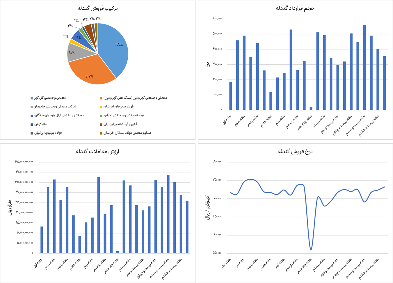 نمودارهای زیر ترکیب فروش، ارزش معاملات، حجم قرارداد و نرخ فروش گندله سنگ آهن را نشان میدهد. گندله سنگ آهن از ابتدای سال جاری تا هفته بیست و نهم، 8 میلیون و 629 هزار تن جمعا به ارزش حدودا 62،000 میلیارد تومان در بورس کالا معامله شده است. شرکتهای فولاد امیرکبیر کاشان، فولاد مبارکه اصفهان، فولاد تاراز چهارمحال، ورق خودروی چهارمحال و بختیاری و صنایع هفت الماس بالغ بر 95 درصد عرضه این محصول را در بورس کالا به عهده دارند. این محصول در حال حاضر حدودا 7.3 میلیون تومان به ازای هر تن معامله میشود که نسبت به هفته گذشته رشد 1.2 درصدی داشته است.