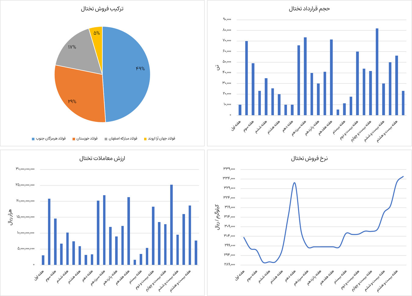 نمودارهای زیر ترکیب فروش، ارزش معاملات، حجم قرارداد و نرخ فروش تختال را نشان میدهد. تختال از ابتدای سال جاری تا هفته بیست و نهم، 996،000 تن جمعا به ارزش حدودا 30،400 میلیارد تومان در بورس کالا معامله شده است. شرکتهای فولاد هرمزگان جنوب، فولاد خوزستان، فولاد مبارکه اصفهان، فولاد جهان آرا اروند عرضه این محصول را در بورس کالا به عهده دارند. این محصول در حال حاضر حدودا 33.5 میلیون تومان به ازای هر تن معامله میشود که نسبت به هفته گذشته رشد 0.93 درصدی داشته است.